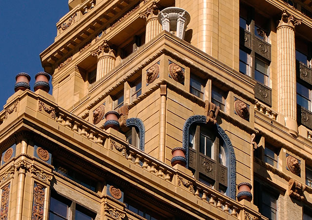 See links at bottom of page for info on one of Houston's most interesting buildings. Still working at processing this photograph. The Nikon D100 original shows a great deal of detail, and I'm going to work with several crops of this image. See links at bottom for more info on this building. Posted above crop 2/7/04.