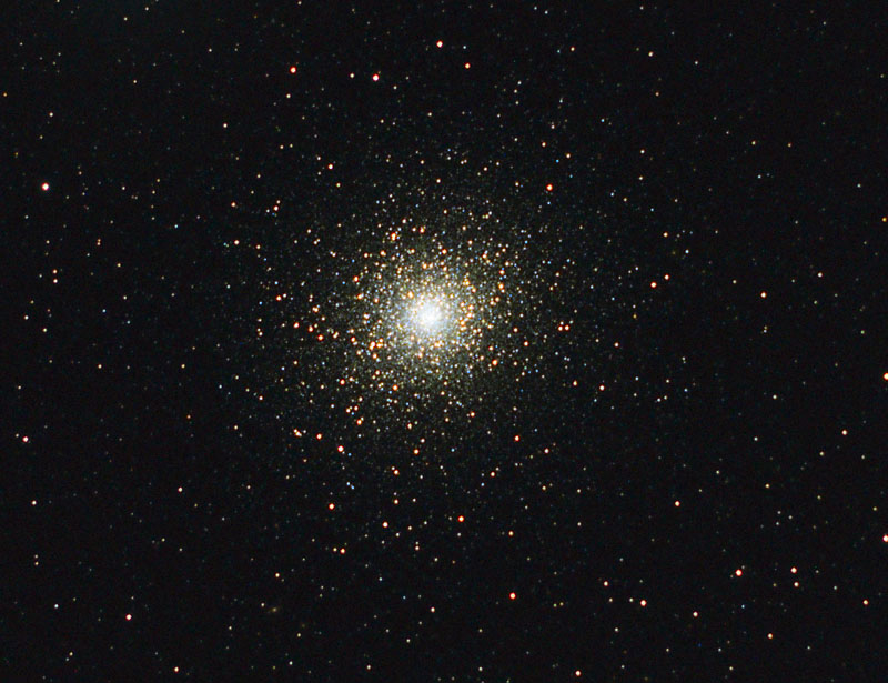M5 is a nice globular cluster that is estimated to be nearly 13B years old and about 25M light years away. If you look at the bright star lower right, you may note that it is not uniform. That's because it's a double star. Quoting SEDS: The bright nearby double star 5 Serpentis was also cataloged as Struve 1930, and consists of components A, 5 mag, pale yellow, and B, 10 mag, light grey.